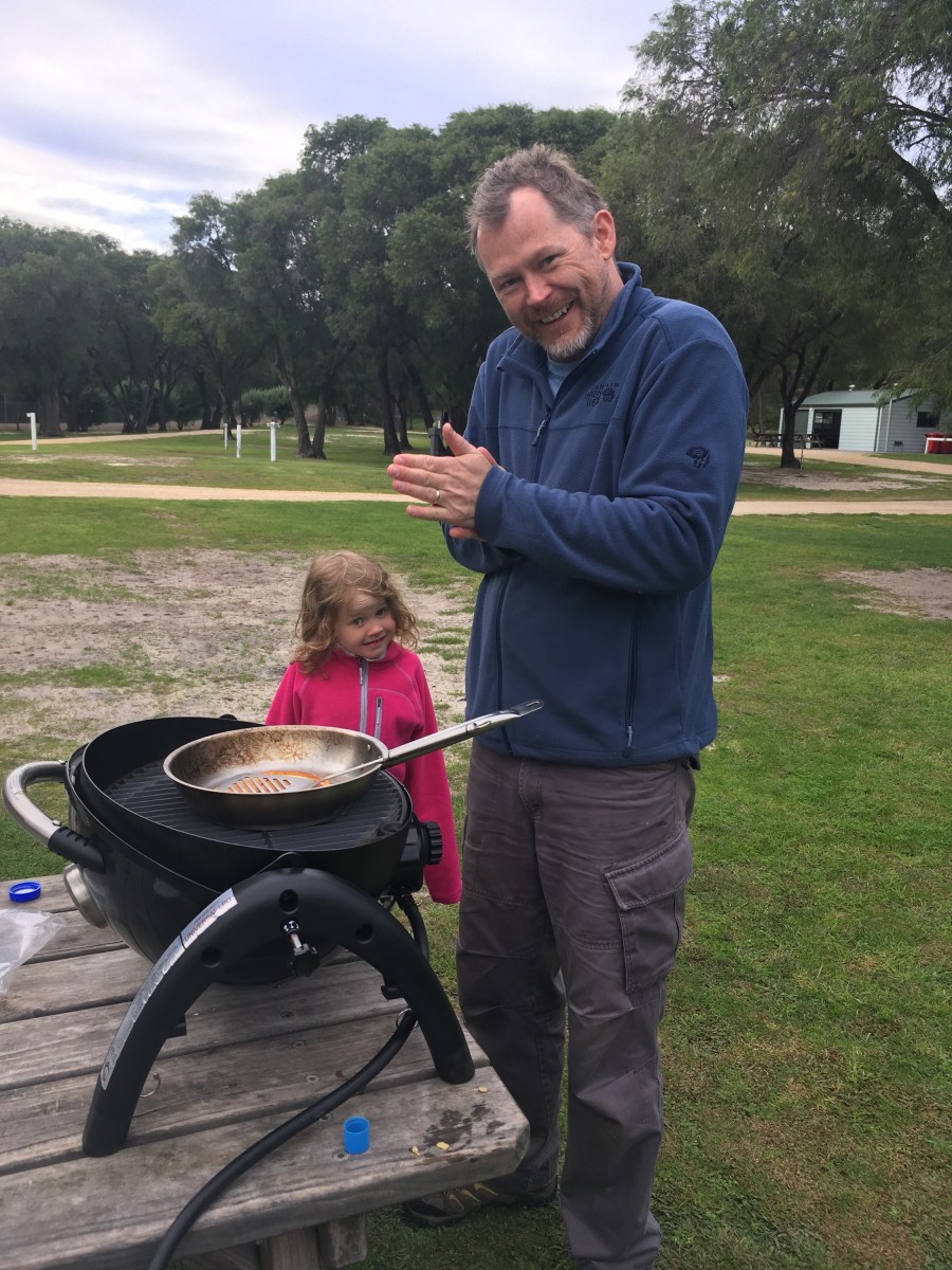 The man of the (motor) house. Making pancakes.