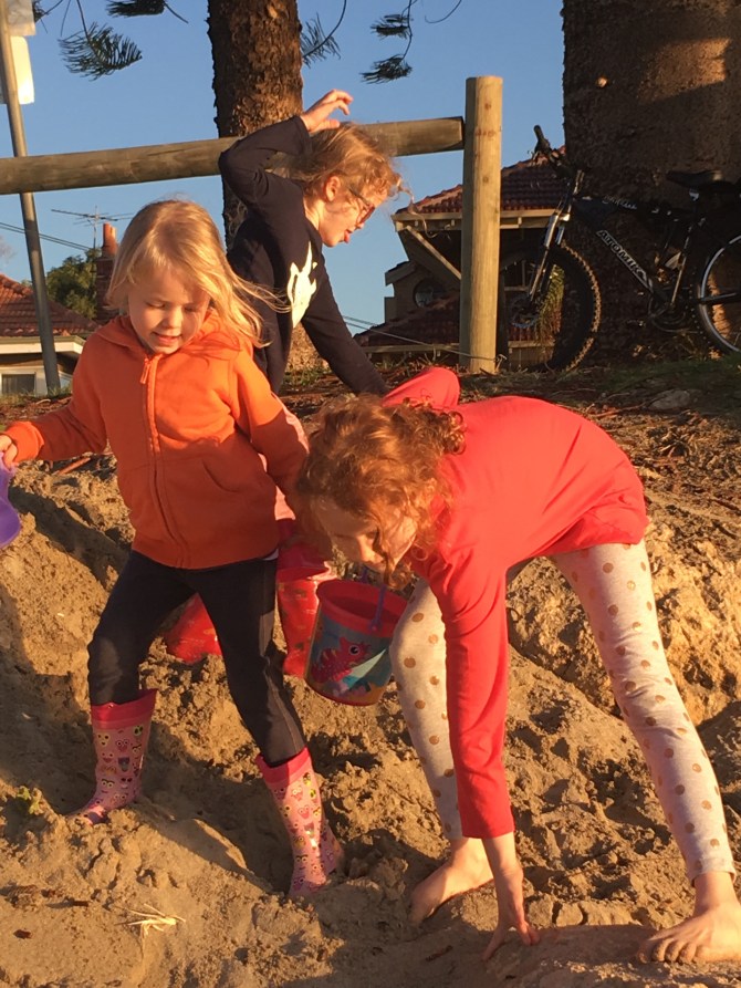 It’s so beautiful down on the beach. The air is so cool and fresh. The scenery is always changing with the weather, and there are often boats coming and going. Some fishermen had a tiny dog that loves children and was adored by Lani. All three girls ran off up the beach with it after the poor thing fell in the water jumping from boat to jetty, so he needed a run to get dry again.