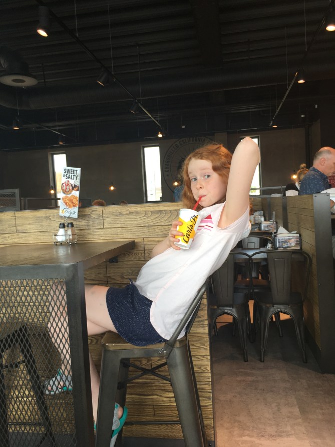 Sweet Emily sat in a little kid’s accidental wee puddle in the (rather dimly lit) play area of the place we stopped for lunch. Quite a bit of cleanup was involved for our Em, who was a good sport about it. She looked for the silver lining and found one- it was an interesting story!