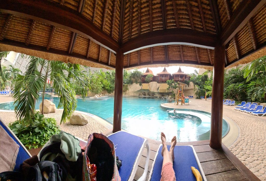 Enter: the largest indoor water park in the world, housed in a former aircraft hangar, in an airfield in Bandenburg. It hosts in excess of 8,000 visitors per day, can accommodate several thousand overnight guests, and even has hot air balloon rides! 26 degrees celcius and 64% humidity. Always.
