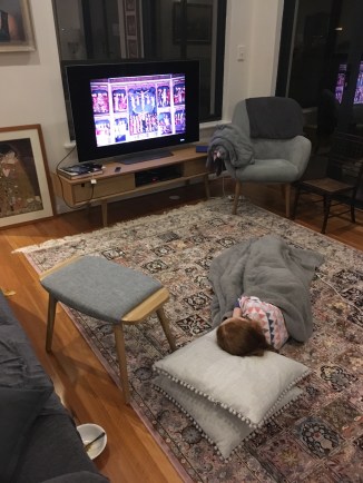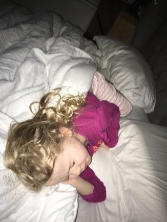 A small person laying diagonally across a bed makes it hard for an adult person to find space to sleep :-)