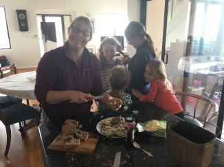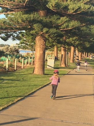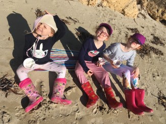 Aunty Natty and Beth came down to see us. Beth drove all the way and back again! We had soup and toasted sandwiches and then the girls scootered or rollerbladed with Beth while the mummies walked with cups of tea, all the way to the foreshore park. Then we returned for some fresh ‘disaster bread’ (as Emily likes to call it) with butter and jam.