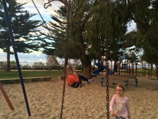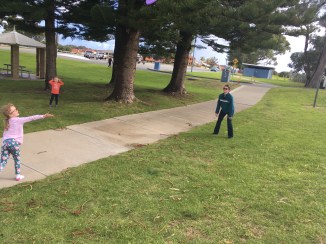 We walked down the Esplanade to a playground and then the temperature dropped and we started to make for home but the rain got us! We took refuge for a few moments in the public toilet but then decided to make a run for it. It was good enforced exercise!! π
